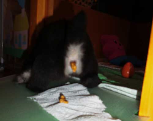 ist eine fiese Fleischwunde. Nun muss Frauchen meinen Bauch gut pflegen,