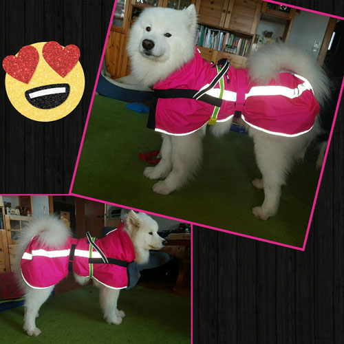 Frauchen hat die Zeit genutzt und die alten Regendecken, die nicht zu gebrauchen waren, da sie sehr rutschten, mit einem Geschirr versehen und noch ein paar Änderungen und unsere Jungs sind nun auch für kurze Spaziergänge regenfest ...