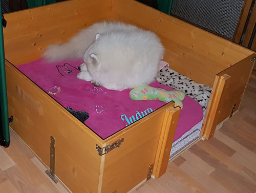 Endlich sind meine Leute fertig mit Wohnzimmer umräumen, putzen, Welpen-Boden rein und Wurfkiste aufbauen